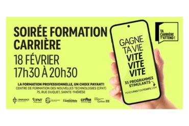 📢 Parents et élèves de secondaire 3-4-5, vous êtes invités à prendre part à la SOIRÉE FORMATION CARRIÈRE! Venez découvrir plus de 35 programmes le mercredi 18 février au Centre de formation des Nouvelles-Technologies (75, rue Duquet à Sainte-Thérèse) de 17h30 à 20h30. 👀 Cet événement est organisé par les 5 centres de formation professionnelle […]